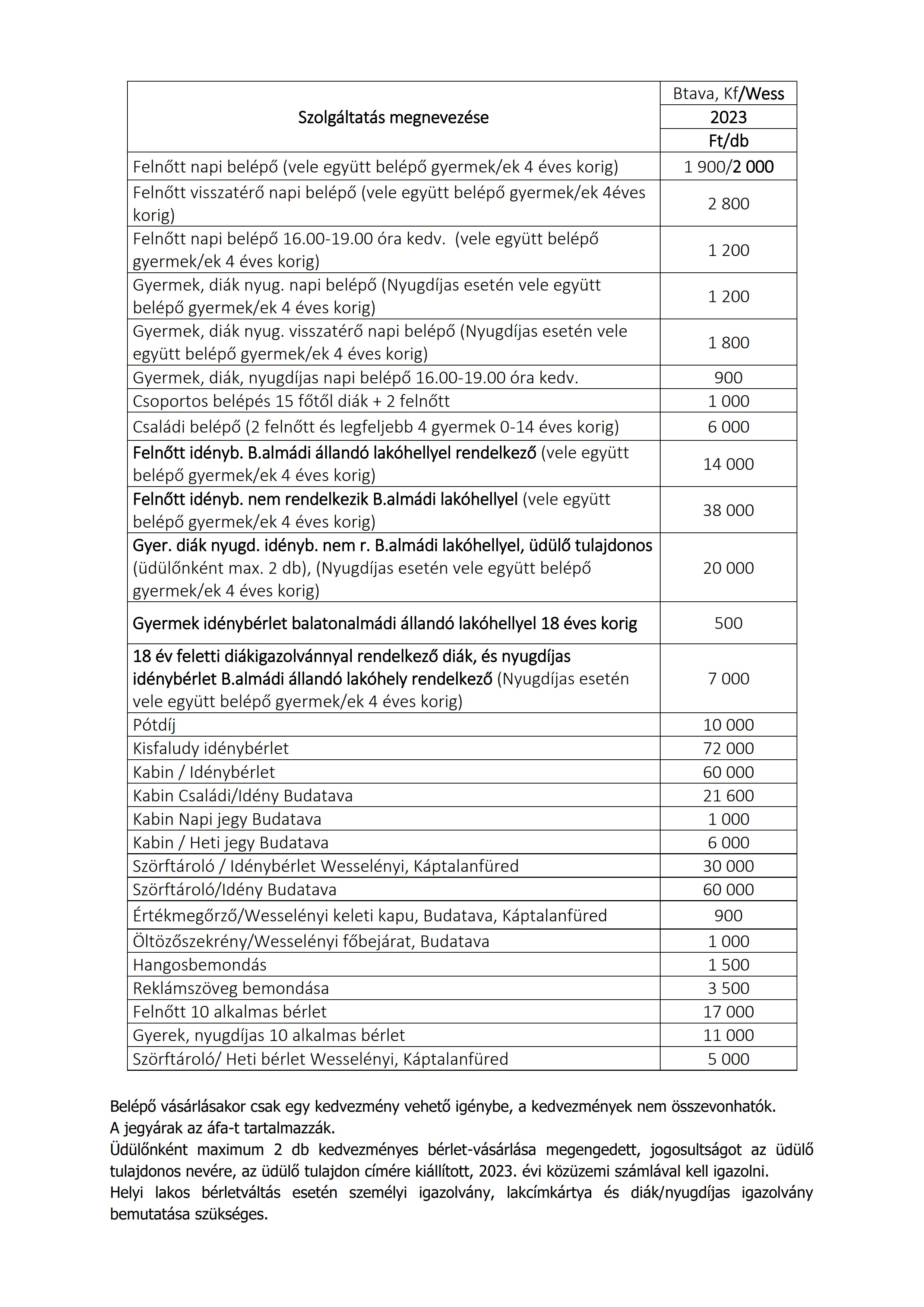2023. ÉVI Strandjegyárak Balatonalmádi Város Önkormányzata által üzemeltetett strandokon