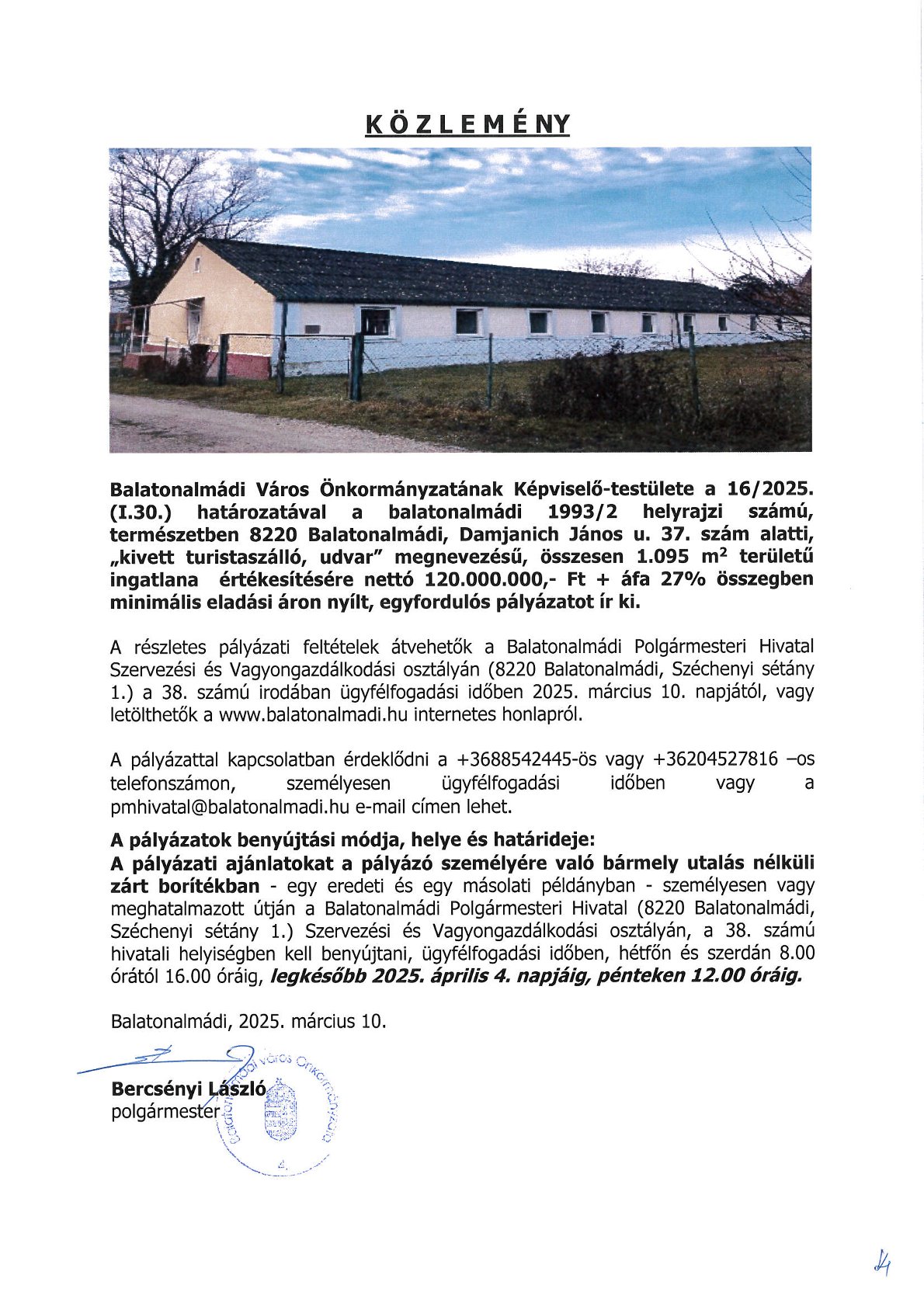 Közlemény pályázati felhívásról, Balatonalmádi, Damjanich utca 37., 2025.03.10.