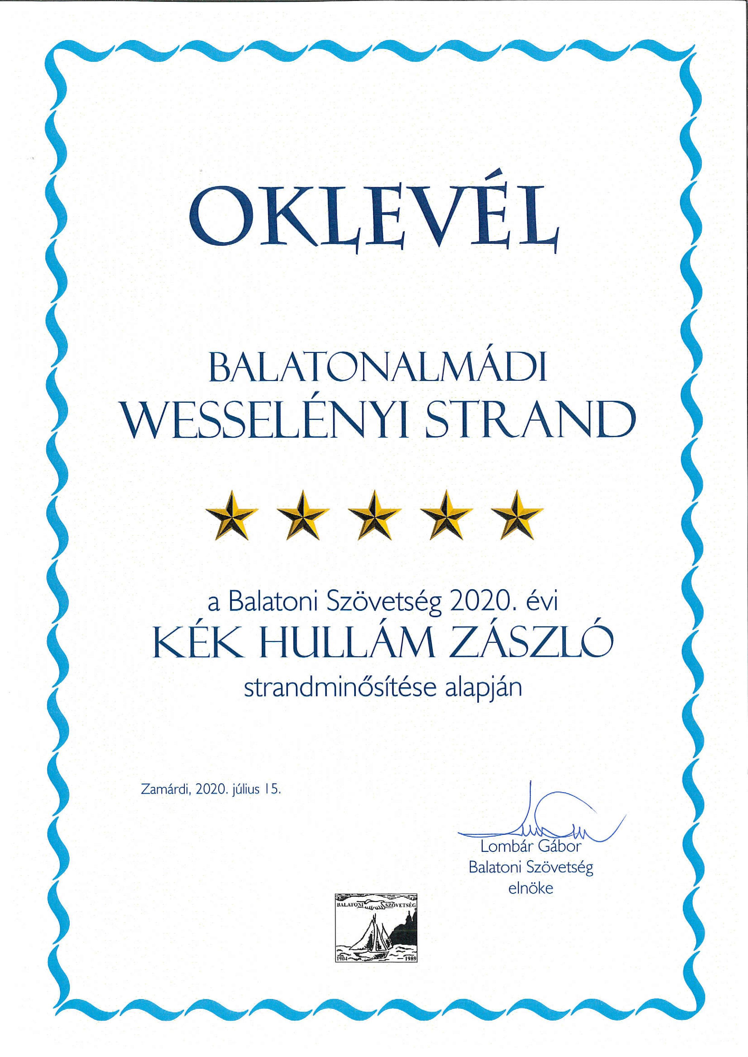 A Balatoni Szövetség Kék Hullám Zászló 2020. évi strandminősítésén a Wesselényi strand 5 csillagos minősítést kapott.