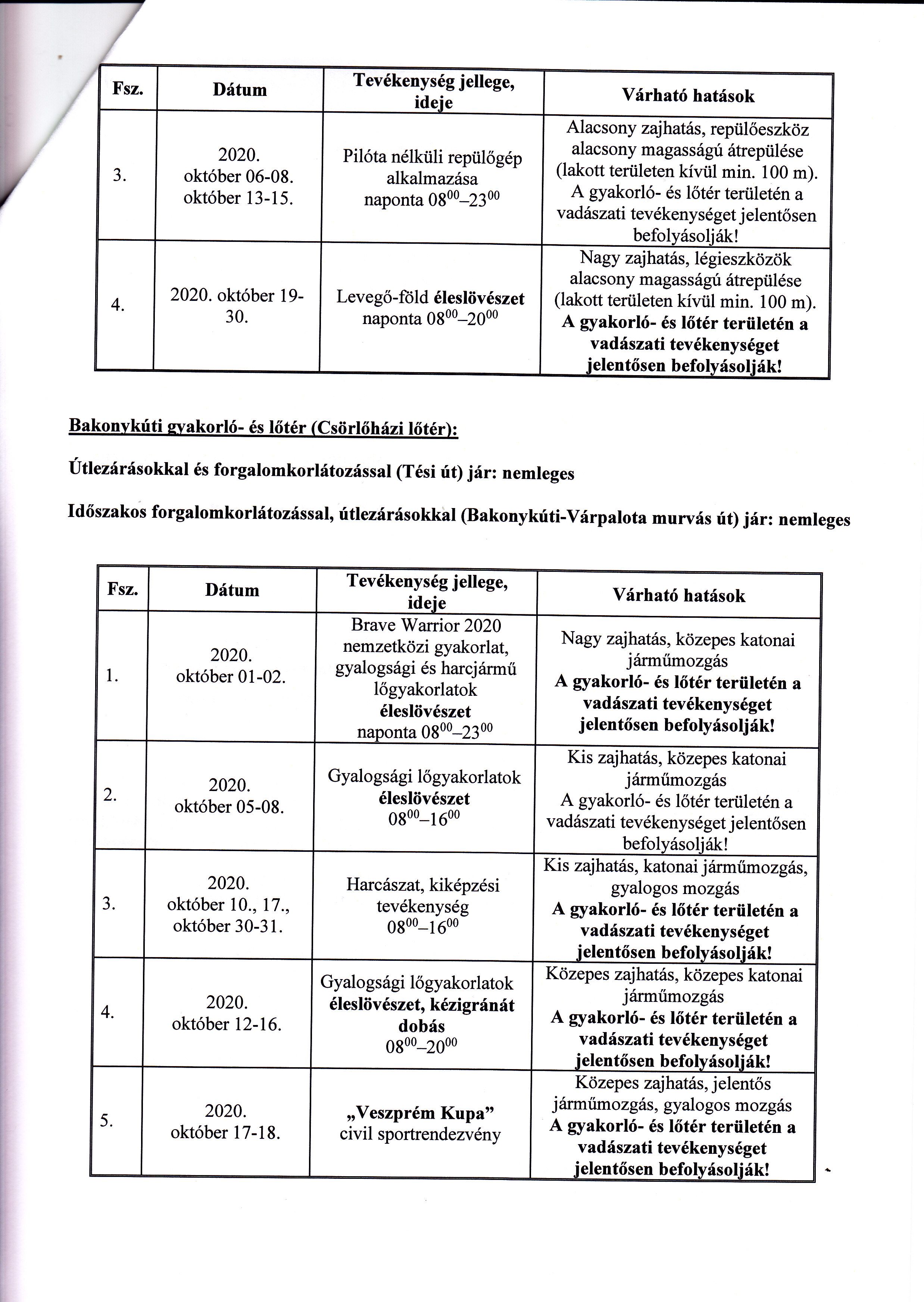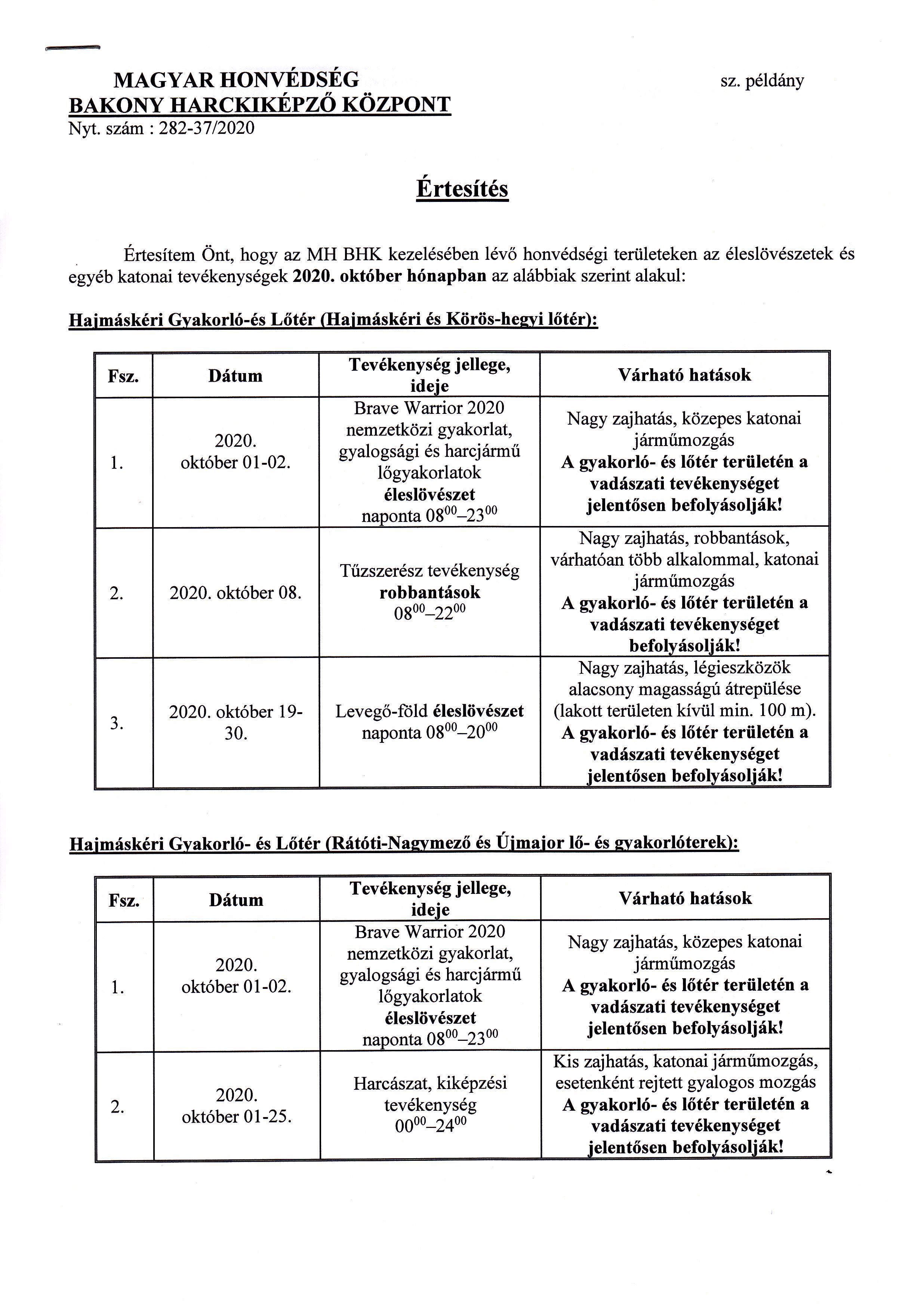 MH Bakony Harckiképző Központ 2020. Október havi lőtérértesítője
