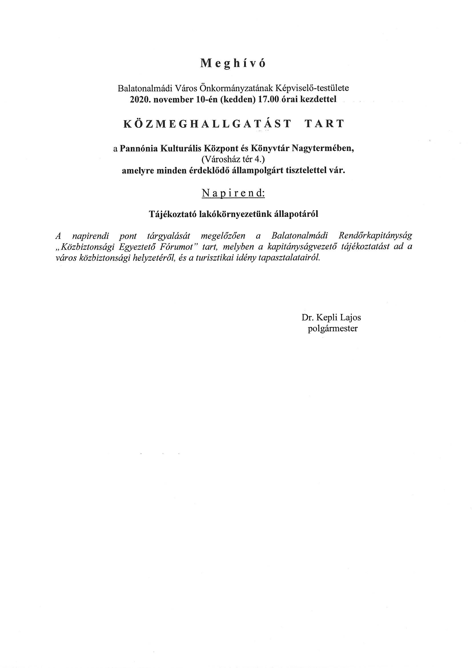 Balatonalmádi Város Önkormányzatának Képviselő-testülete 2020. november 10-én közmeghallgatást tart.