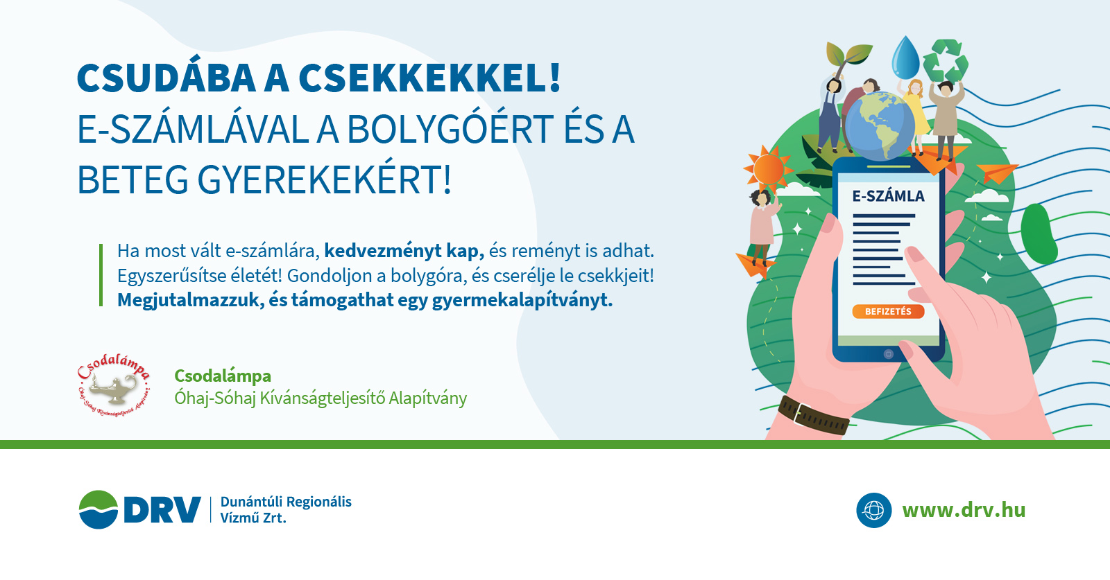 A Dunántúli Regionális Vízmű Zrt. kampánya, melynek kedvezményezettje a Csodalámpa Óhaj-Sóhaj Kívánságteljesítő Alapítvány, eddig 2320 felhasználót ösztönzött arra, hogy e‑számlára váltson. Az új díjnetes regisztrációkhoz kapcsolódóan július 31-ig összegyűlt 1.160.000 forintnyi összegből már két kórházban ápolt gyerek, Viktória és Csaba kívánságát teljesítették, és még további kérések várnak a megvalósulásra.
