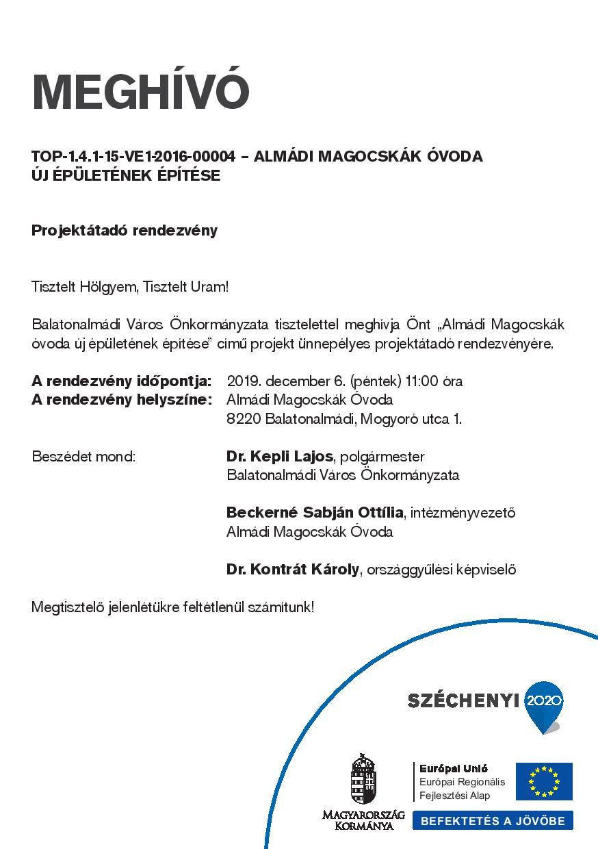 Az Almádi Magocskák Óvoda új épületének ünnepélyes átadására 2019. december 6-án 11 órakor kerül sor.