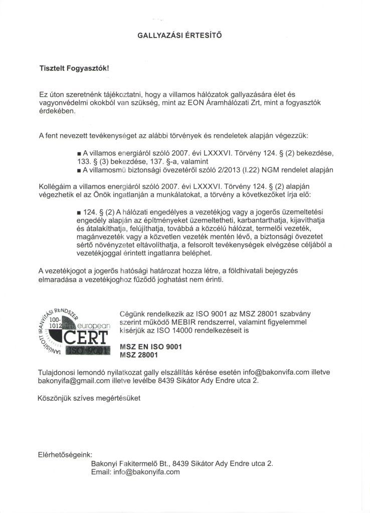 BakonyiFa tájékoztatója és Tulajdonosi értesítője, mivel az E.ON Észak-dunántúli Áramhálózati Zrt Veszprémi Üzeme soronkívüli gallyazást kért a társaságtól.