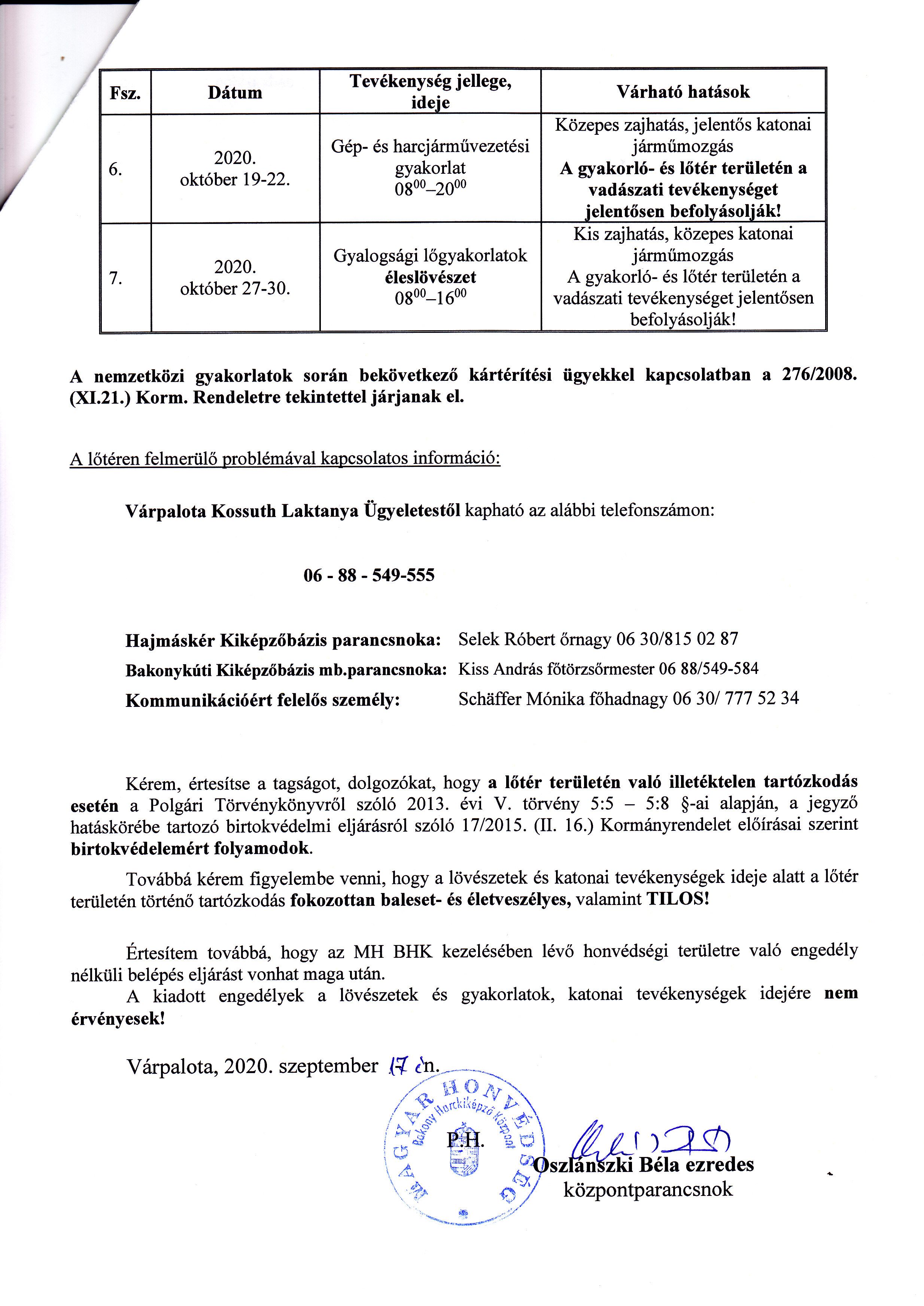 MH Bakony Harckiképző Központ 2020. Október havi lőtérértesítője