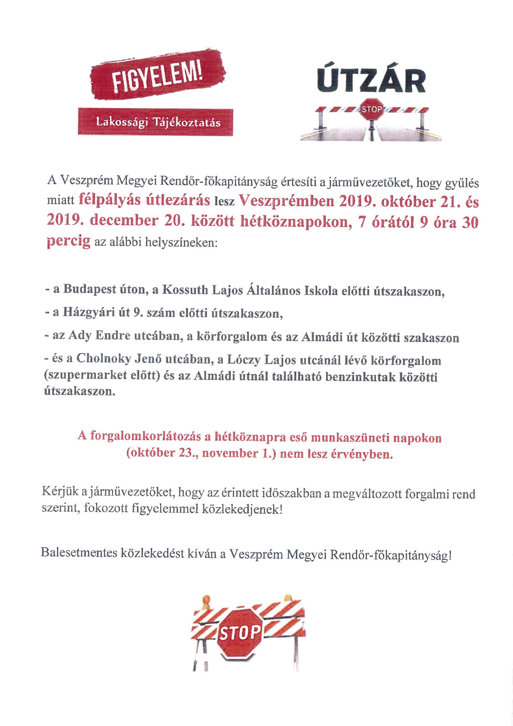 Félpályás útlezárás Veszprémben 2019. október 21 – december 20. között hétköznapokon 07:00 – 9:30-ig