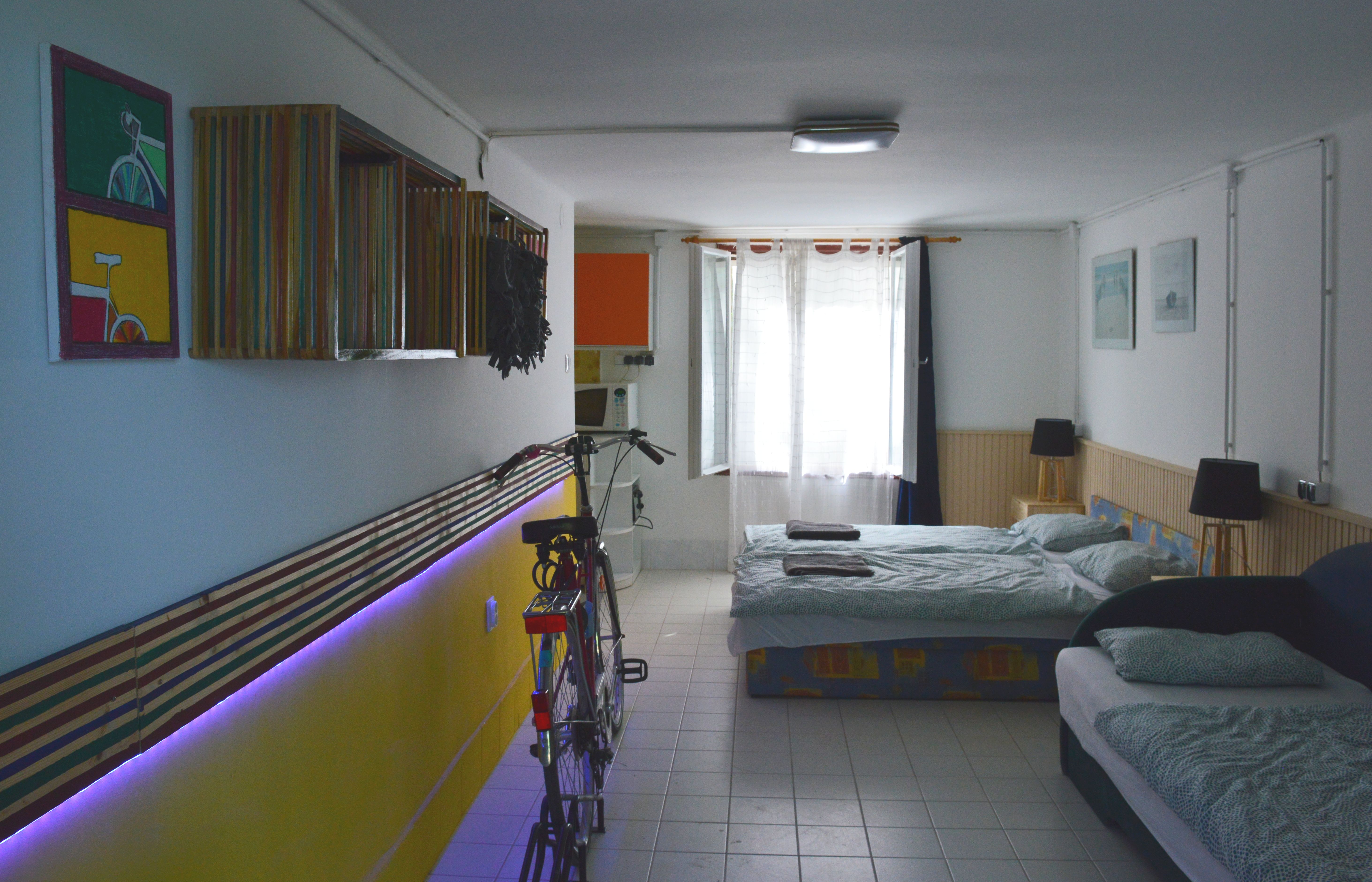 Kerékpáros túrázók részére alakítottuk ki 2 db külön bejáratú stúdióapartmanunkat a Káptalanfüredi strand és a vasútállomás vízparti utcájában. Mindkét apartmanban 2 fős, de a kinyitható ágyakon maximum 8 főt tudunk egyszerre fogadni. Az apartmanokban bringatároló is van 2-2 bicikli tárolására. A felújított apartmanok hangulatosak, egyszerűek, színesek és tiszták. A kertkapura kulcsszéfeket helyeztünk, melyek számkóddal nyithatók, így vendégeink előzetes időpont egyeztetés nélkül bármikor el tudják foglalni az apartmanokat délután 3 óra után. A kódokat SMS-ben küldjük el vendégeinknek.